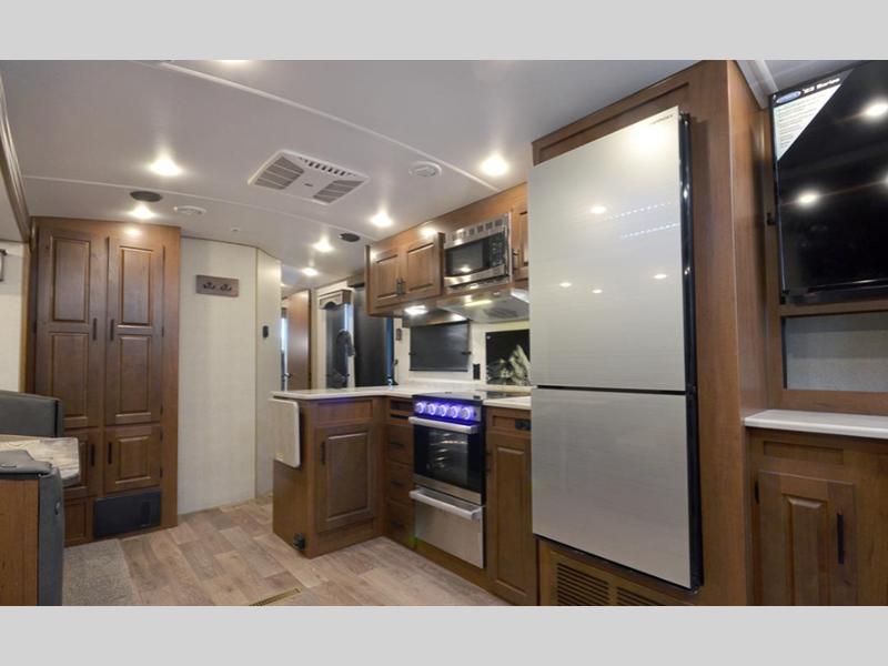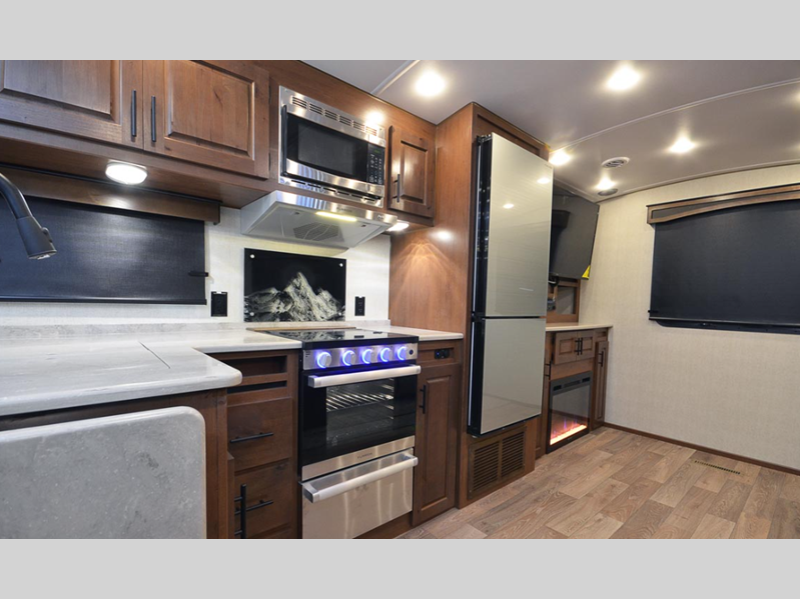 These models are designed with a rugged 8" chassis with XL ground clearance and 5,200 lb. axles for camping trips across the nation. You will appreciate the 10-gallon water heater, the XL refrigerator, plus the 15,000 A/C to keep you comfortable during the summer months. The mountain lodge interiors will have you feeling like you're staying at a lodge in the forest, and the LG solid surface countertops will add that touch of luxury.